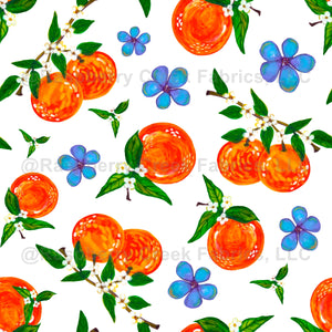 Watercolor orange citrus fruit with leaves and tiny white orange blossoms surrounded by blue flowers on white. Spring, Summer, Fruit, Floral. Hero for the Marmalade Collection.