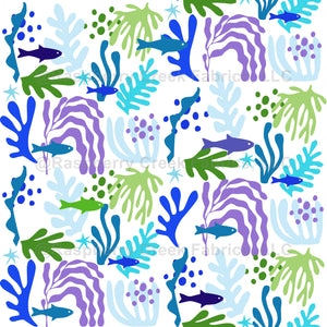 A Matisse inspired fish and seaweed organic shapes pattern in blue.