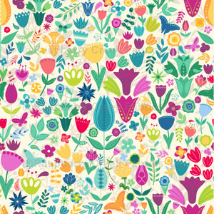 Maximal Folk Floral Light. Tulips, flowers, leaves, and butterflies in bright colors in a Scandanavian style pattern.