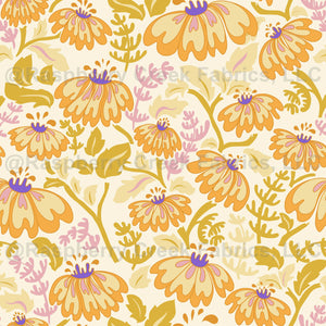 Large-scale Floral meadow flowers and soft, flowing natural shapes bring cheerful seventies vibes. Bright pop colors in buttercup yellow, energetic orange, mustard yellow and cool purple and pink..