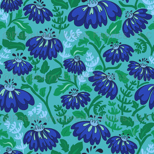 Large-scale Floral meadow flowers and soft, flowing natural shapes bring cheerful seventies vibes. Bright pop colors in teal, blue, and green.