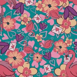 Artsy flamingos delivering valentines on a field of love hearts and flowers.