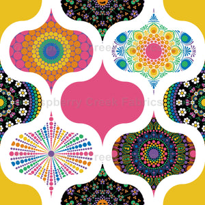 Mid century modern patchwork in this ogee cheater quilt pattern using dot mandalas from our Maximalist Rainbow color palette collections.