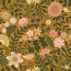 Floral pattern in a modern style with a diversity of wildflowers and overlapping leaves.