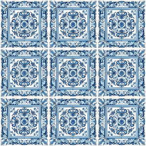 Elegant, stylish and sophisticated pattern with Mediterranean tiles in blue and white color. Modern and trendy, perfect for the Azulejo lover.
