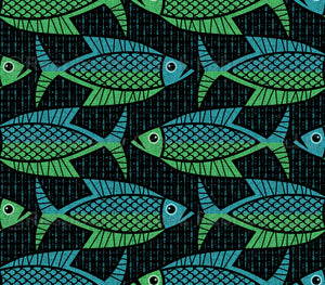 My original vector illustrations of MCM inspired color block fish in green and blue on black, with faux texture throughout the design.©Christine Duffield 2023