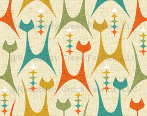 My original vector illustration of mid century inspired cat silhouettes and stars, in orange, yellow, green and aqua, with a hint of white, on tan, with faux texture throughout the design. ©Christine Duffield 2020
