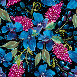 Boho watercolor floral berries and blooms in sapphire blue, ruby, and green on black. Botanical details and splatter in a full, large scale garden design