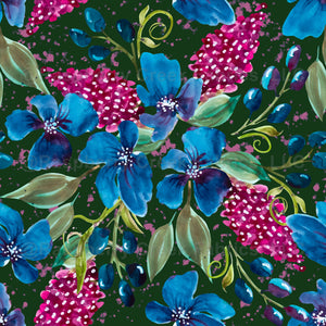 Boho watercolor floral in sapphire blue, ruby, and green on emerald green. Botanical details and berries in a full, large scale garden design. Garden, lush,Spring, Summer, fabric, wallpaper, home decor