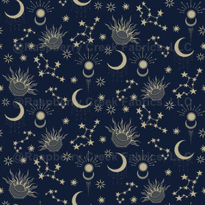 A cosmic midnight blue pattern featuring moon phases, constellations and star accents. Perfect for celestial-themed decor and nursery rooms.