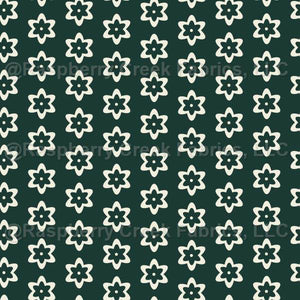Minimalist geometric flowers in dark emerald green and warm ivory beige, a small-scale blender perfect for quilts, modern decor, and versatile projects.