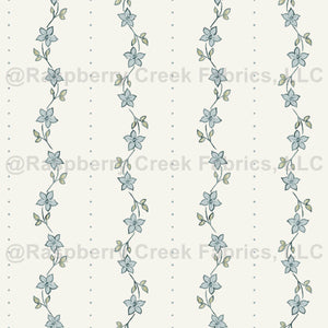 Mira is a sweet cottage floral stripe with a hand-printed look, featuring delicate blossoms arranged in flowing bands paired with a dotted stripe.