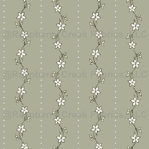 Mira is a sweet cottage floral stripe with a hand-printed look, featuring delicate blossoms arranged in flowing bands paired with a dotted stripe.