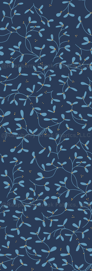 Add a touch of winter elegance to your sewing projects with this enchanting botanical fabric pattern. Delicate mistletoe branches in soft blue tones flow across a deep navy background, accented with tiny golden berries for a warm, festive touch. The seamless layout creates a graceful, organic movement — ideal for both subtle statement pieces and full-surface designs.