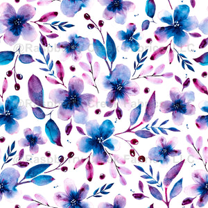 Watercolor blooms and botanicals in shades of blue and magenta on white.Tiny splatter details. Hero-Misty Blue Magenta Floral Collection