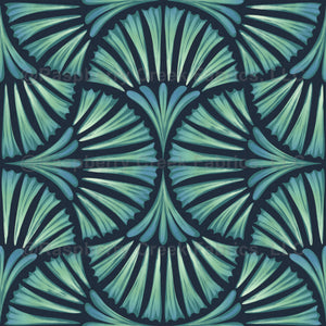 A modern and dramatic take on Art Deco. A stylized brush-stroke geometric thistle pattern on a deep teal blue background with ombre teal/aqua/green strokes. The perfect stunning statement fabric for your home decor or apparel project
