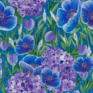 Modern floral features blue poppies and purple hydrangeas with green leaves against a blue background. From an original acrylic on canvas. Hero in the Belissima Floral Collection
