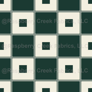 Minimalist geometric blocks in dark forest emerald green and warm ivory beige create a rich, modern cheater quilt design. Perfect for home decor and quilts.