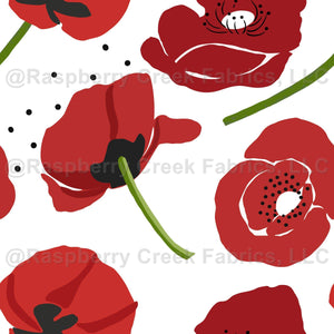 Large poppies in bold and vibrant reds. Poppy flowers are reds and black with a few green stems on white background.