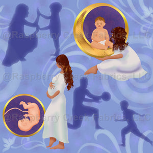 This design celebrates motherhood and the joy of having children. This particular version celebrates the bond that mothers have with their sons. Decorative flourishes on periwinkle create a beautiful backdrop for the artwork.