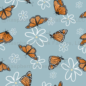 Monarch Butterflies on Dusty Blue with Simple White Flowers