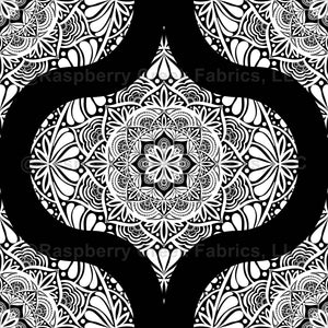 A touch of midcentury modern elegance in a retro ogee pattern using our abstract floral monochrome mandala in white on black.