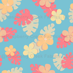 Fresh tropical monstera leaf and hibiscus flowers pattern with blue summer background