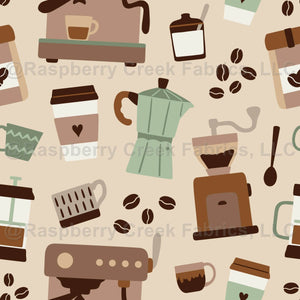 Cutecoffee pattern with coffee cups to go, coffee mugs and differentcoffee makers. This pattern is perfect for kitchen backsplash, teatowels or coffee shop wallpaper or accessories.
