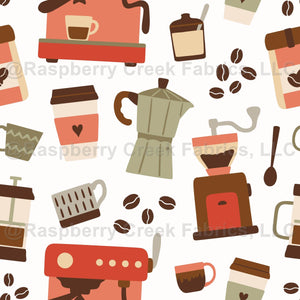Cutecoffee pattern with coffee cups to go, coffee mugs and differentcoffee makers. This pattern is perfect for kitchen backsplash, teatowels or coffee shop wallpaper or accessories.