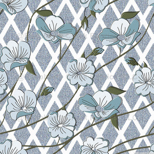 Soft blue morning glory flowers wind around a garden trellis in seamless floral beauty.