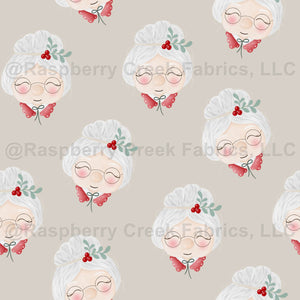 This festive print features sweet watercolor-style Mrs. Claus faces on a cozy beige background. Accented with holly, glasses, and a red polka-dot bow, this design brings a classic and whimsical holiday feel to your Christmas projects. Coordinates perfectly with the Mr. & Mrs. Claus Collection for apparel, quilts, and seasonal decor.