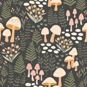 A rich woodland print featuring hand-drawn mushrooms, ferns, berries, florals, and soft botanical textures on a deep charcoal background. The contrast of muted pastels against the dark base gives it a cosy autumn feel, perfect for quilting, apparel, baby clothes, tote bags, accessories, and cottagecore sewing projects. Works beautifully as a statement print in forest, mushroom, botanical, or fall-inspired collections, while still soft enough for nursery and children's pieces.