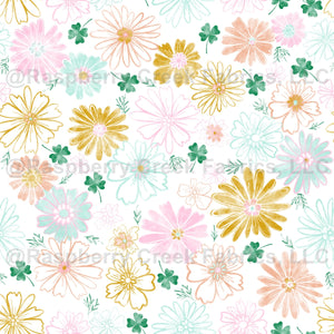 Mustard Pink Mint and Green Textured Shamrock Floral Print Fabric, Happy Go Lucky By Kim Henrie