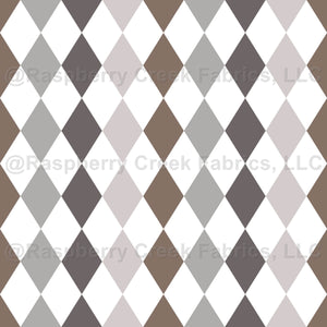 A seamless diamond tessellation featuring interlocking geometric shapes in warm earth tones of gray, beige, white and brown. This repeating pattern creates balanced positive and negative space, offering a modern yet organic feel. Perfect for apparel, home décor, quilting, and accessories, this versatile design brings warmth and structure to any project.