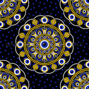Surrealist vibes in a traditional style with this navy and gold dot mandala. Eyes watching you wherever you go in this offset pattern on a dotted black background.