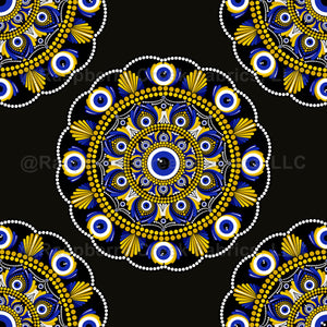 Surrealist vibes in a traditional style with this navy and gold dot mandala. Eyes watching you wherever you go in this offset pattern on a plain black background.