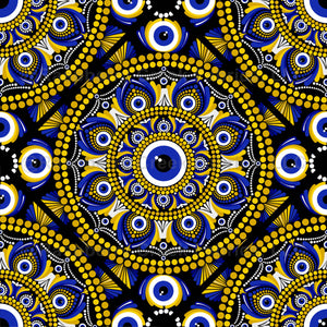 Surrealist vibes in a traditional style with this navy and gold dot mandala. Eyes watching you wherever you go in this tile pattern.