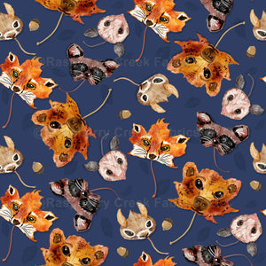 Navy blue, kids, boys, rust, orange, brown, leaves, fall, woodland, forest, boys, opossum, raccoon, bear, fox, squirrel, acorn