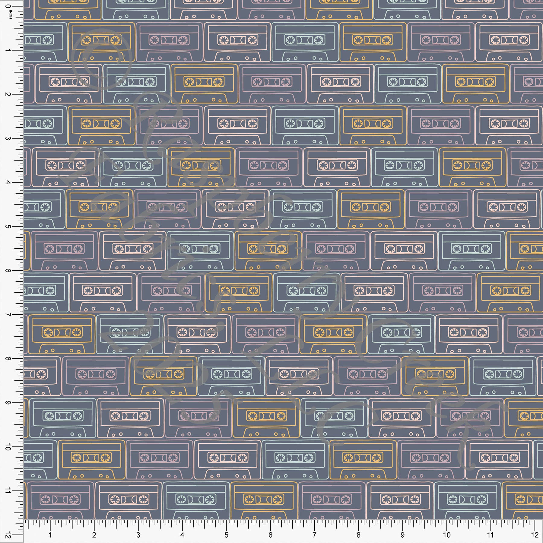 Dark Grey Mauve Mustard and Dusty Mint Mixed Tape Print Fabric, School Is Cool By Kim Henrie for CLUB Fabrics