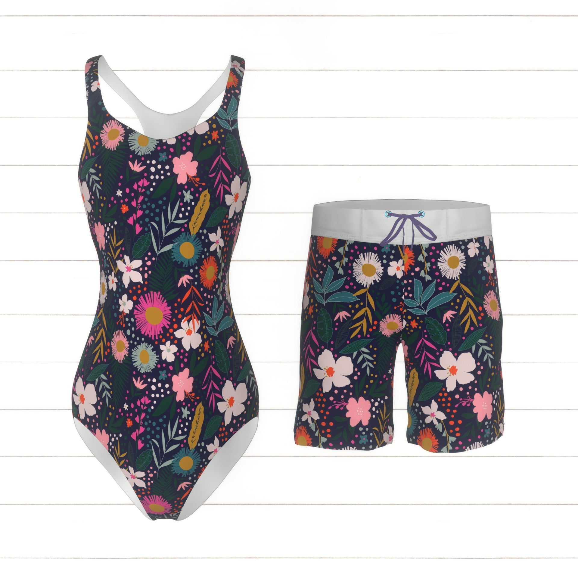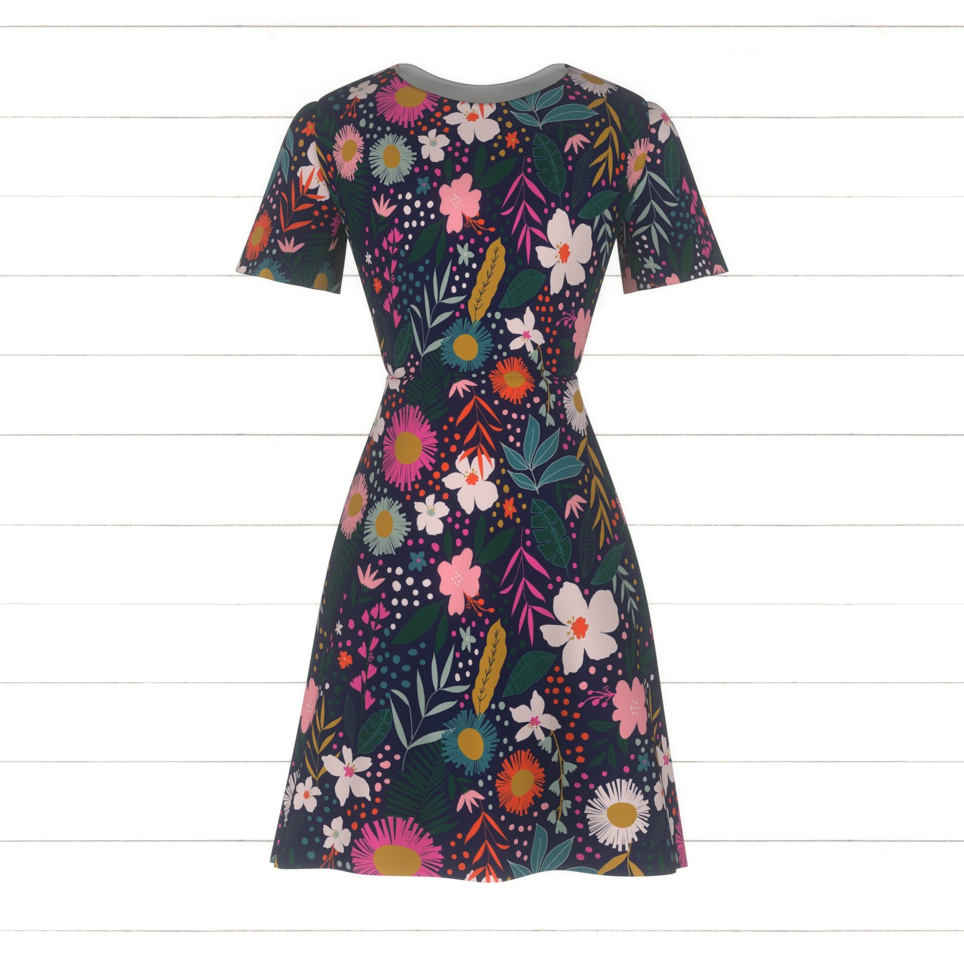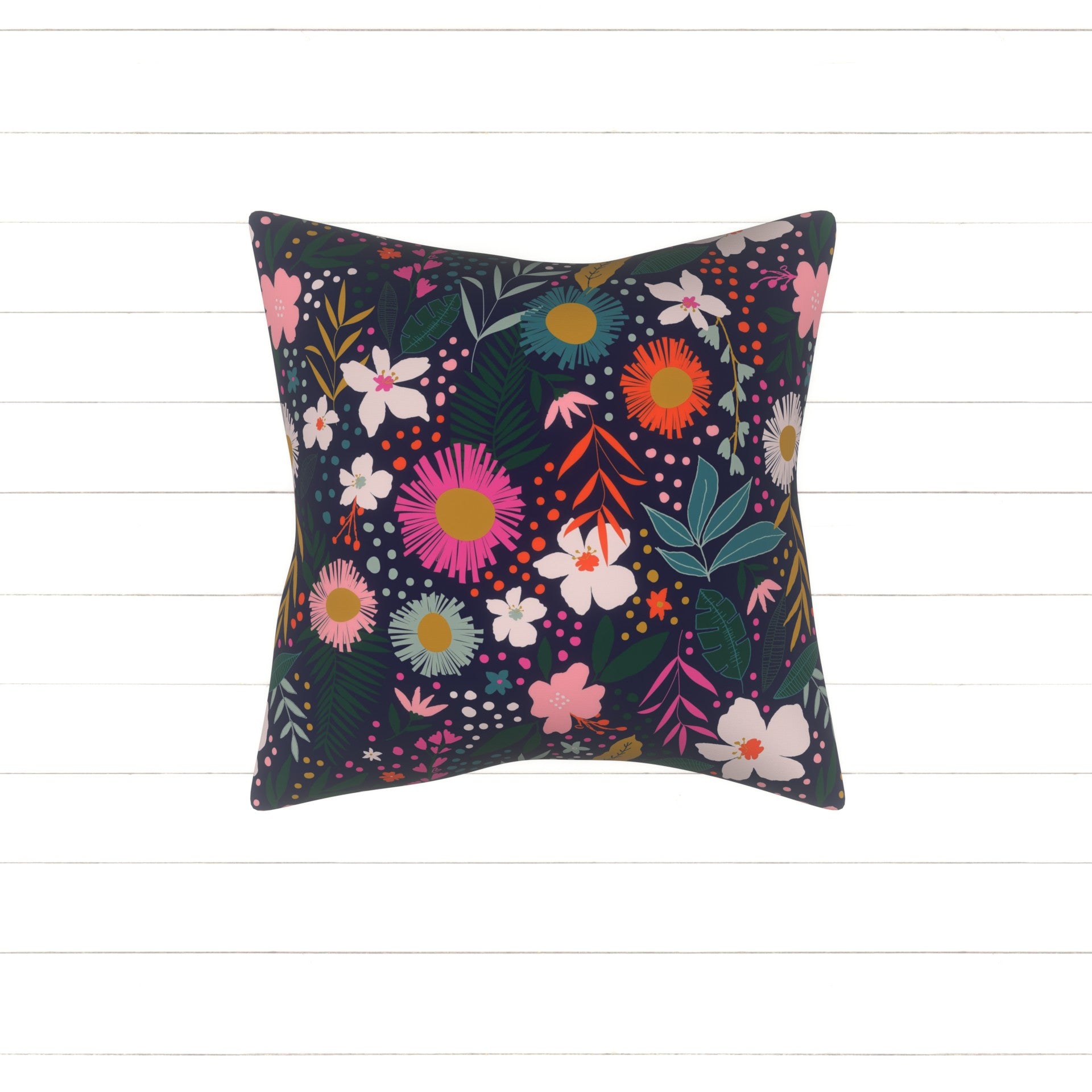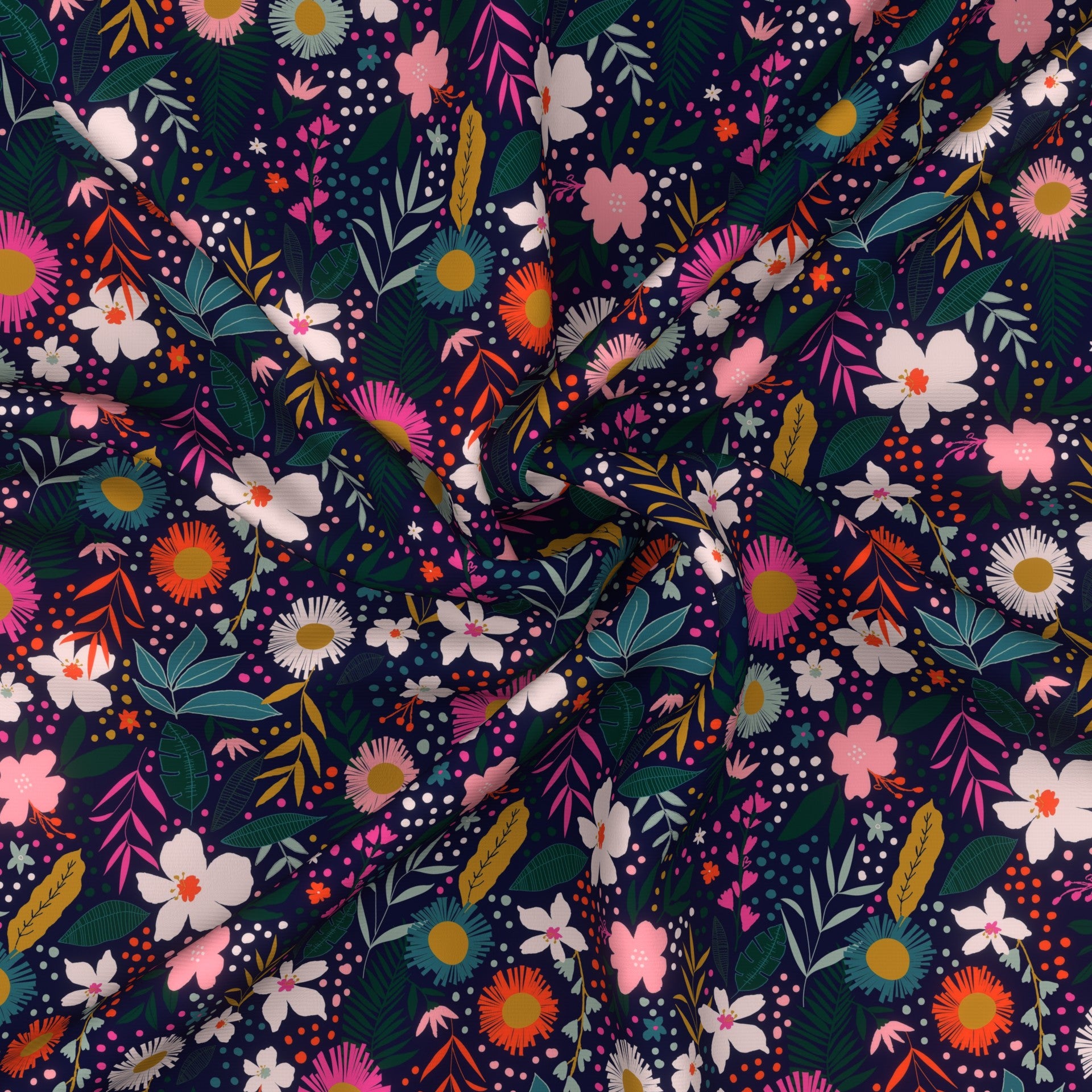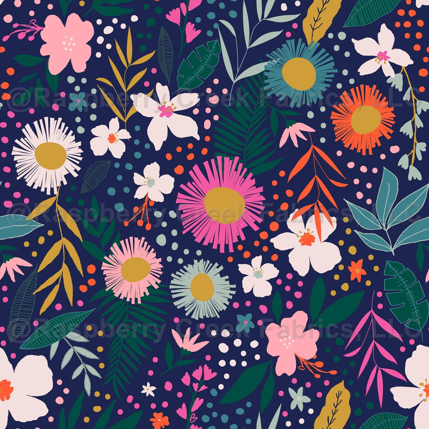 Navy Orange Dusty Pink Mustard and Green Tropical Floral Print Fabric, By Kimberly Henrie