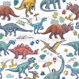 Navy Rust Yellow Mint Vintage Look Playful Summer Dinosaur Print Fabric, Summersaurus by Bri Powell