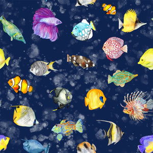 Navy Yellow Magenta Green and Grey Saltwater Fish Print, Under The Sea by Brittney Laidlaw