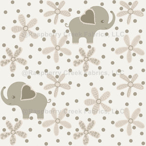 Baby elephants with a heart for ears in neutral shades of taupe for the newborn baby to toddler.