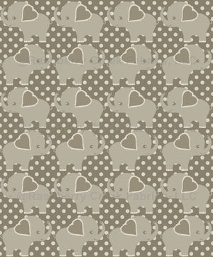 Baby elephants with a heart for ears on a polka dot background all in neutral shades of taupe for the newborn baby to toddler.