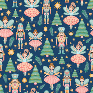 Nutcracker-themed watercolor design with fairies, toy soldiers, festive trees, and stars on a deep blue background
