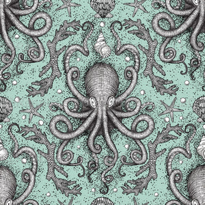 This victorian inspired design, was created from vintage line art of an octopus, seashells and coral, collaged into traditional damask style design, all set against a dreamy shade of Sea Foam Aqua. Perfect for apparel, bathrooms and bedding.