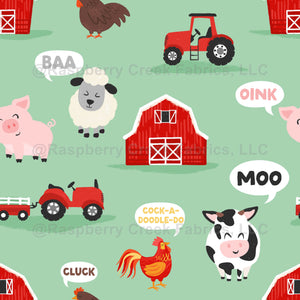 Oink Baa Moo Animals On the Farm Green. Cows, roosters, pigs, sheep, tractors and barns. Animal sounds kids gender-neutral country pattern.
