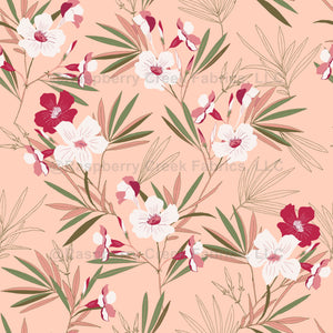 oleander flowers on a peach background. White and magenta flowers with dark green and olive green leaves