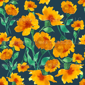 Orange and red watercolor flowers with teal leaves garden party floral on a navy blue background.