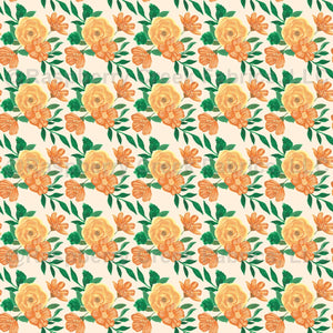 Orange and Yellow Gouache Rose and Wildflowers with bright green leaves and leaf branches on a beige color background